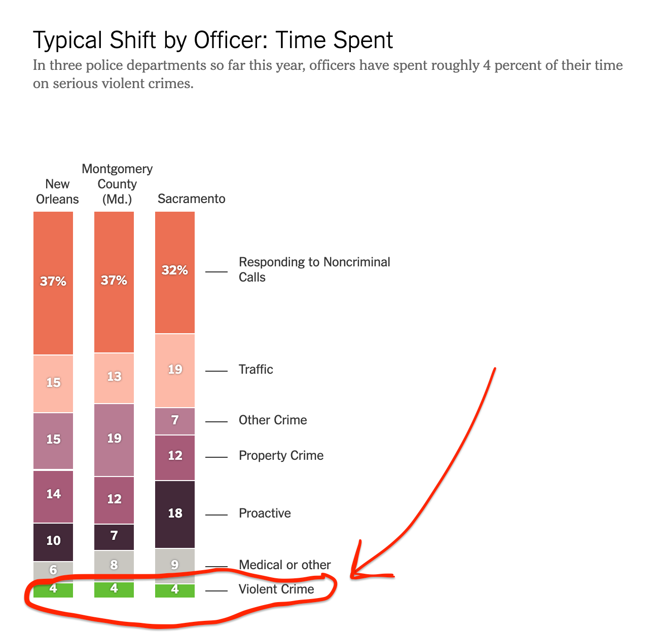 And then down at the bottom of that chart is the itty-bitty portion of their time that is spent on violent crime. So even if you wanted to argue “We need our police because of violent crime.” Fine, for the sake of argument, we’ll keep our police exactly how they are — But only for the four percent of their time that is spent dealing with violent crime.