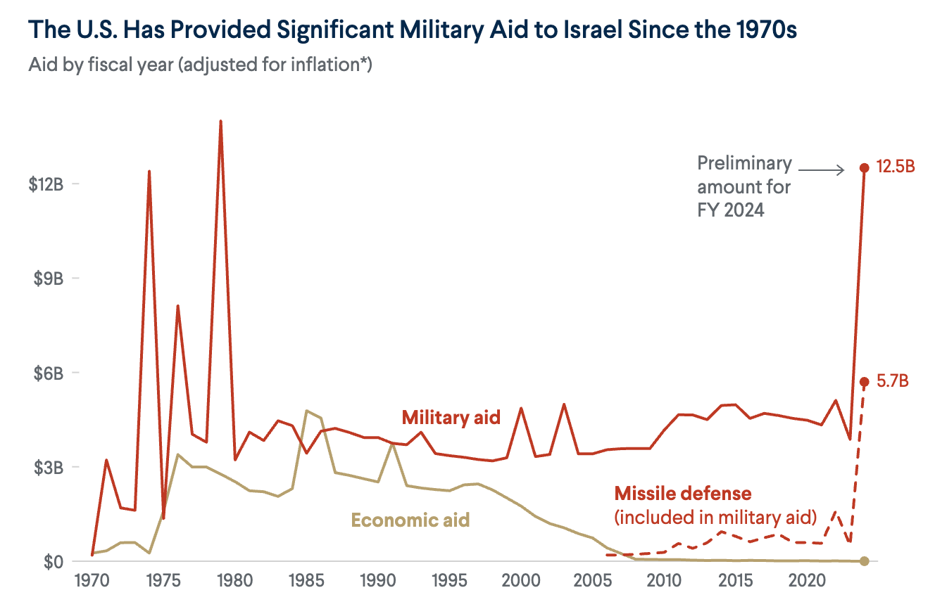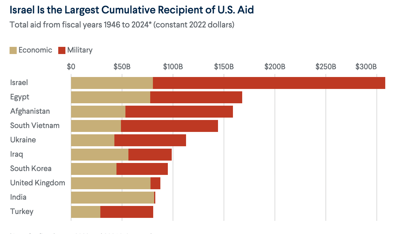 Here’s some handy-dandy charts from the Council on Foreign Relations on just how many taxpayer dollars the US bestows upon our friend and genocider.