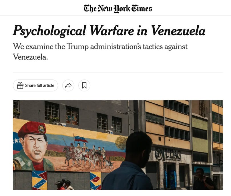 In today’s article about Trump’s psy-op against Venezuela, David E. Sanger tries his best to figure out why Trump (or the National Security State as a whole) is doing what he’s doing. It’s kinda cute to watch the hamsters run around the wheels in Sanger’s brain. (They’re clearly sickly and overweight, not having easy access to Ozempic.)